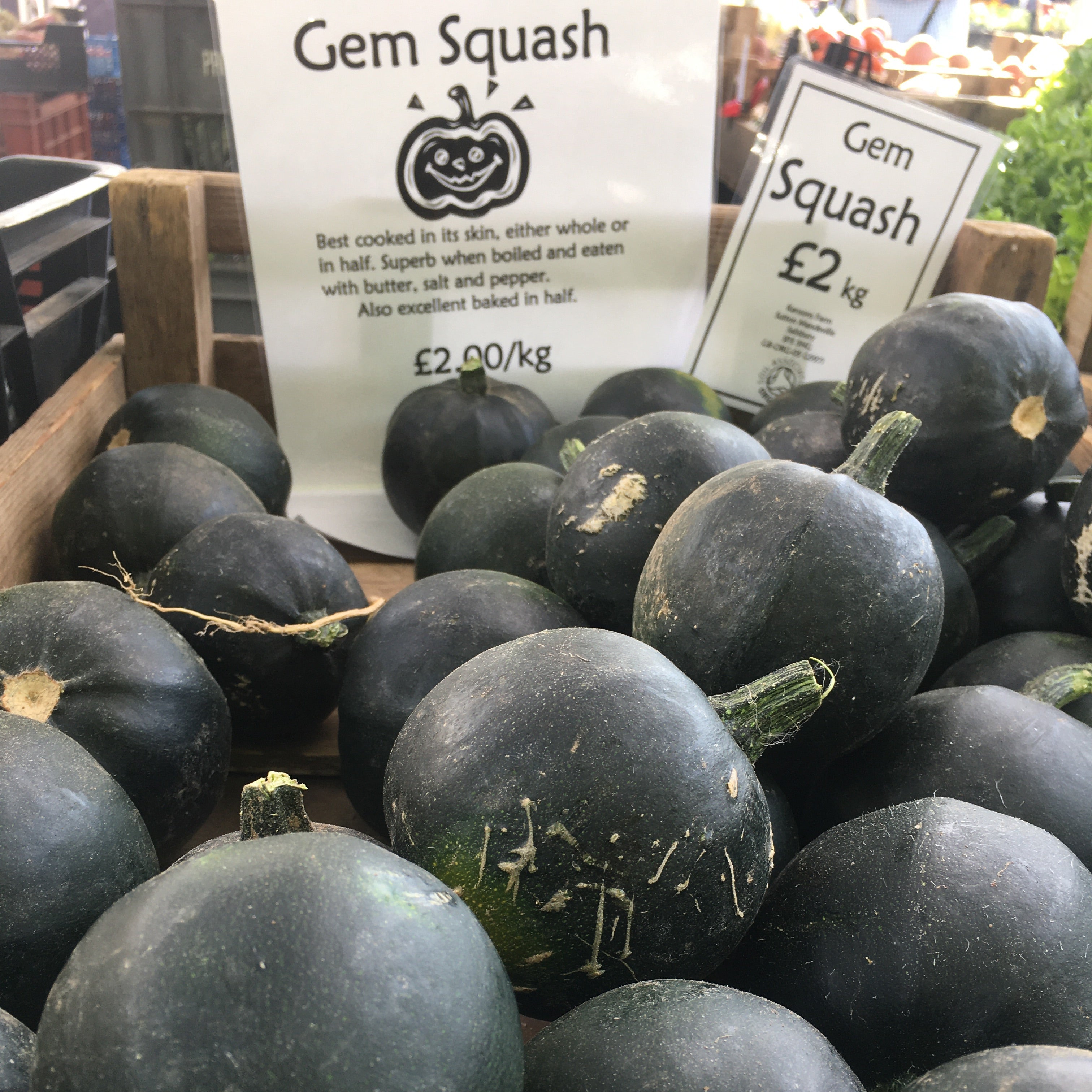 New season gem squash will be back summer 2026!SHOP ALLSadly, gem squash are sold out for this year but I can offer you green pumpkins/squash please see below.. Well known in southern Africa, we grow gem squash in the UK for you to order for home delivery all around the UK by DHL. If you happen to live near Salisbury and Shaftesbury come along to The Veg Shed at the farm, or drop by on market days.